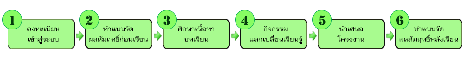2) ขั้นศึกษาเอกสาร 3) ขั้นวางแผน 4) ขั้นลงมือปฎิบัติ 5) ขั้นเสนอและเผยแพร่ และ 6) ขั้นประเมินผล